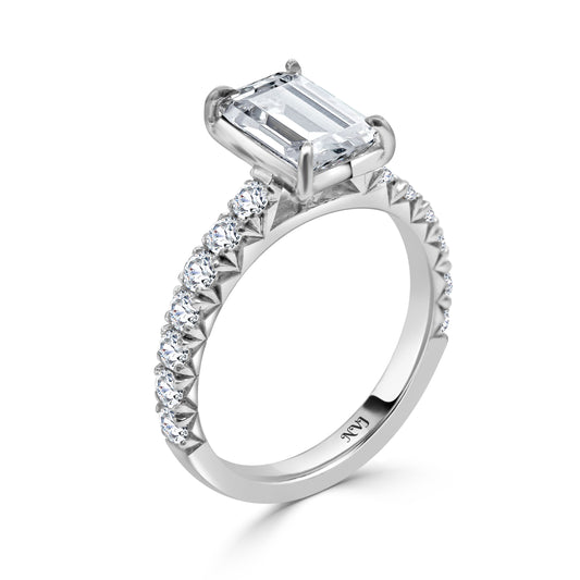 2.14ct Emerald cut lab grown diamond trilogy engagement ring