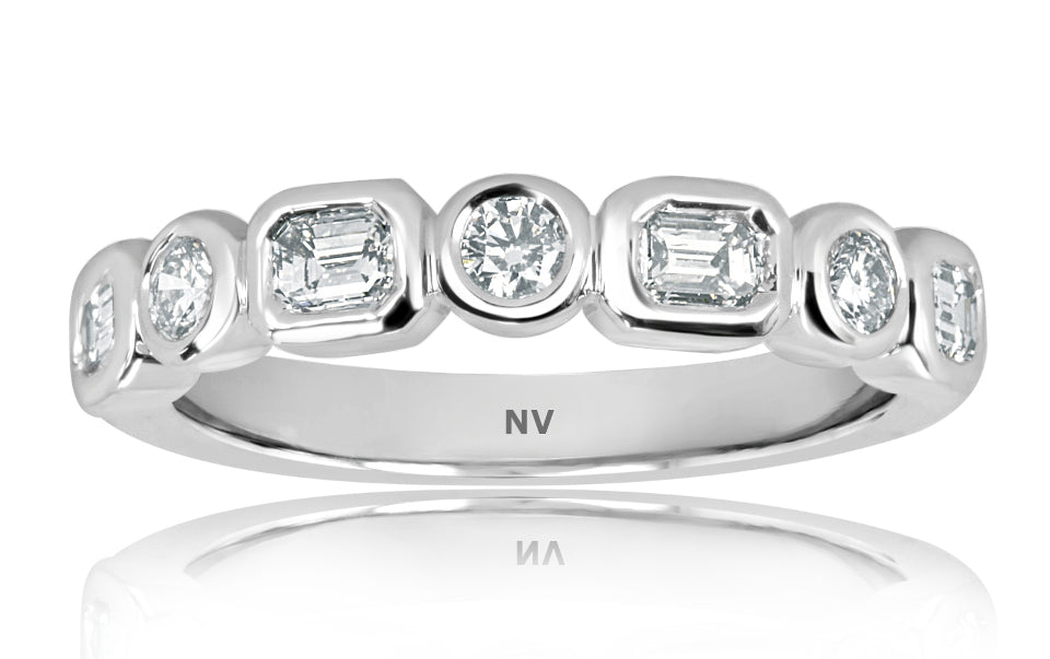 18ct white gold ladies ring set with 4=.44ct Emerald cut diamonds and 3=.19ct round brilliant cut diamonds,