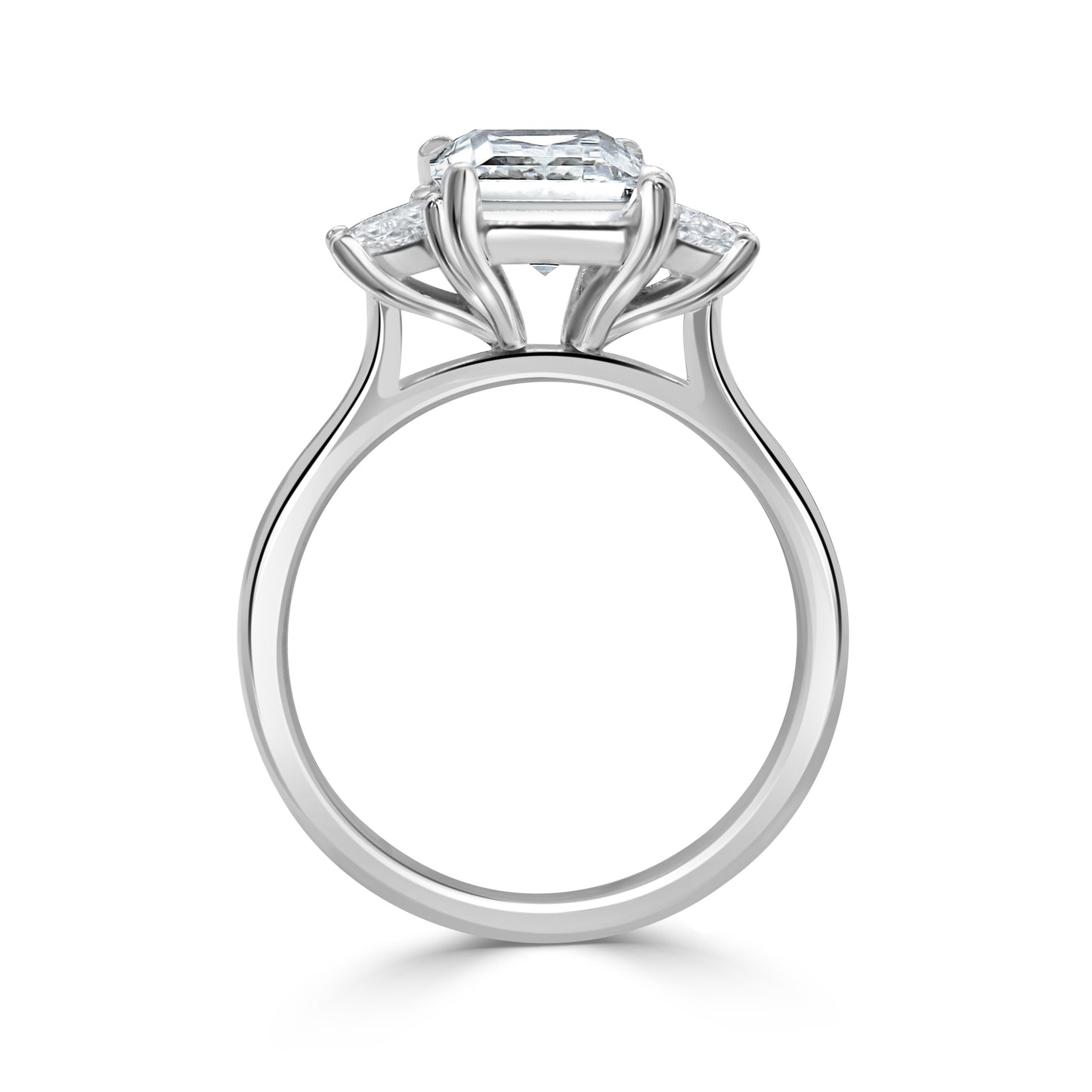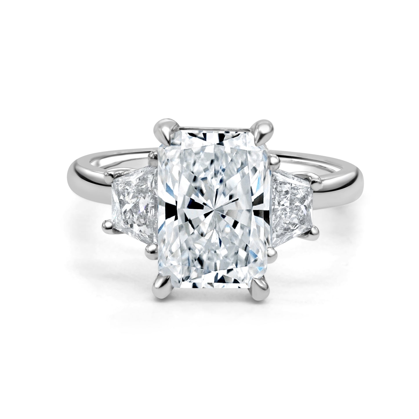 Diamond: 3.01ct Radiant cut lab grown diamond. IGI Certificate ID: LG541256011 Colour E, Clarity VS1. Side Stones: 2=.56ct Trapazoid Lab Diamonds