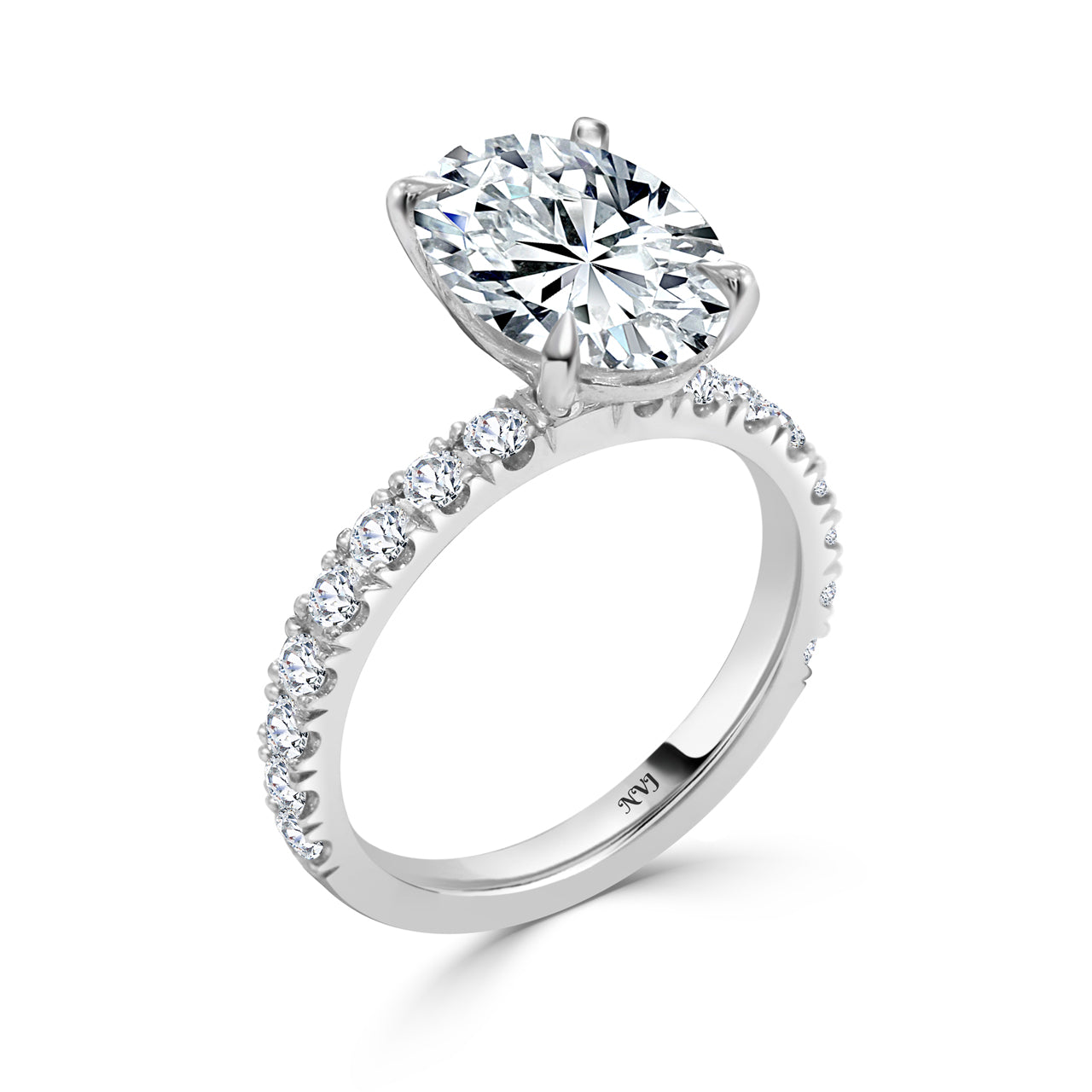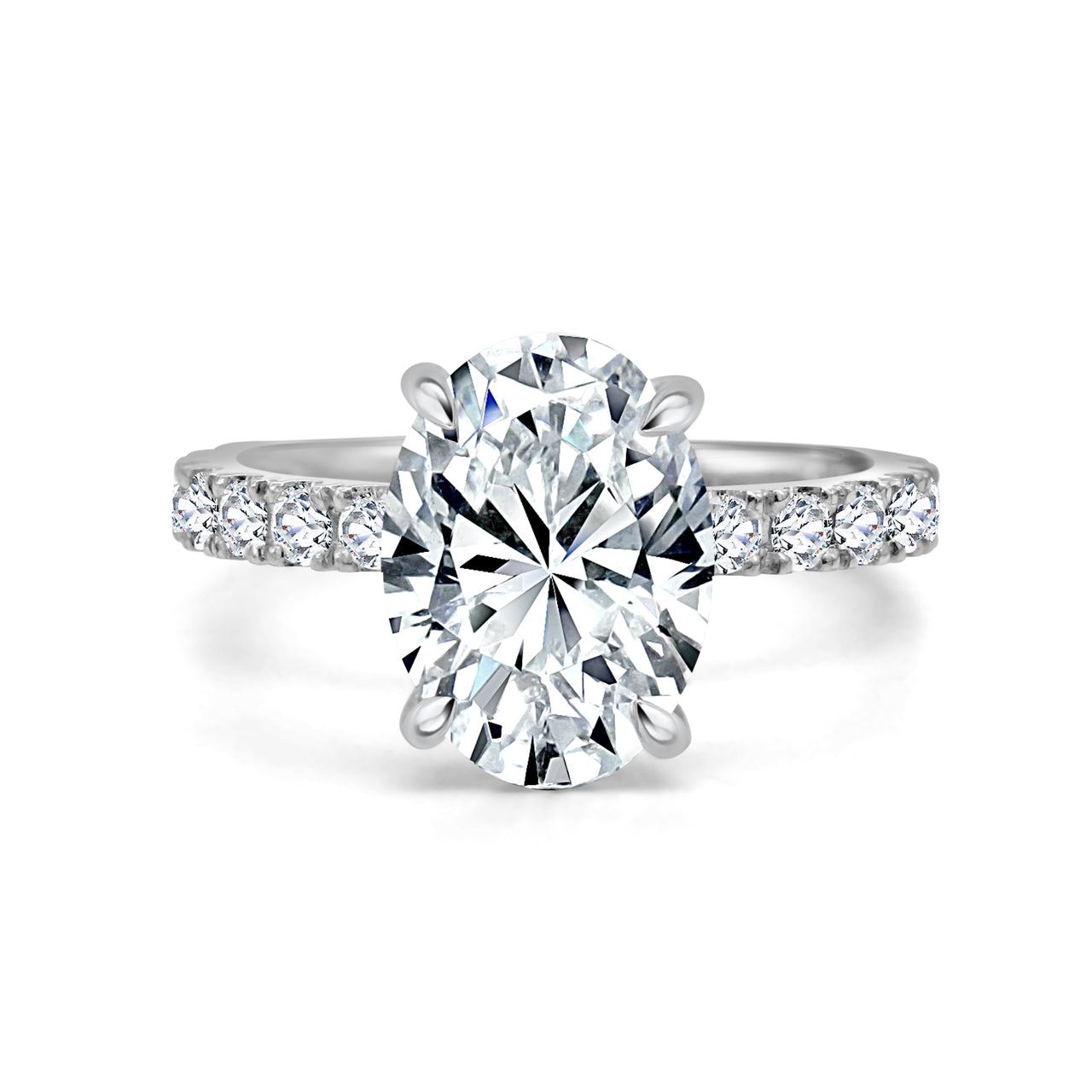 Indulge in the ultimate symbol of love with our 3.51ct Oval cut lab grown diamond engagement ring. Meticulously crafted with 18ct White Gold, this luxurious piece features sparkling diamonds set in a pave band. Elevate your love story with this exquisite ring.
