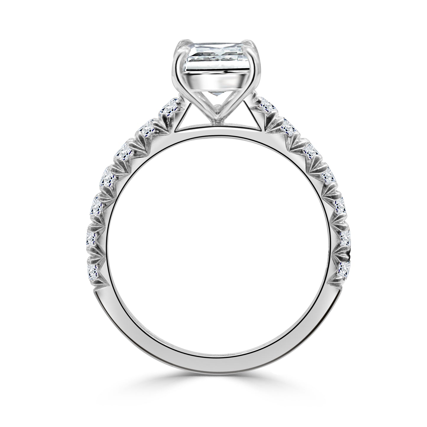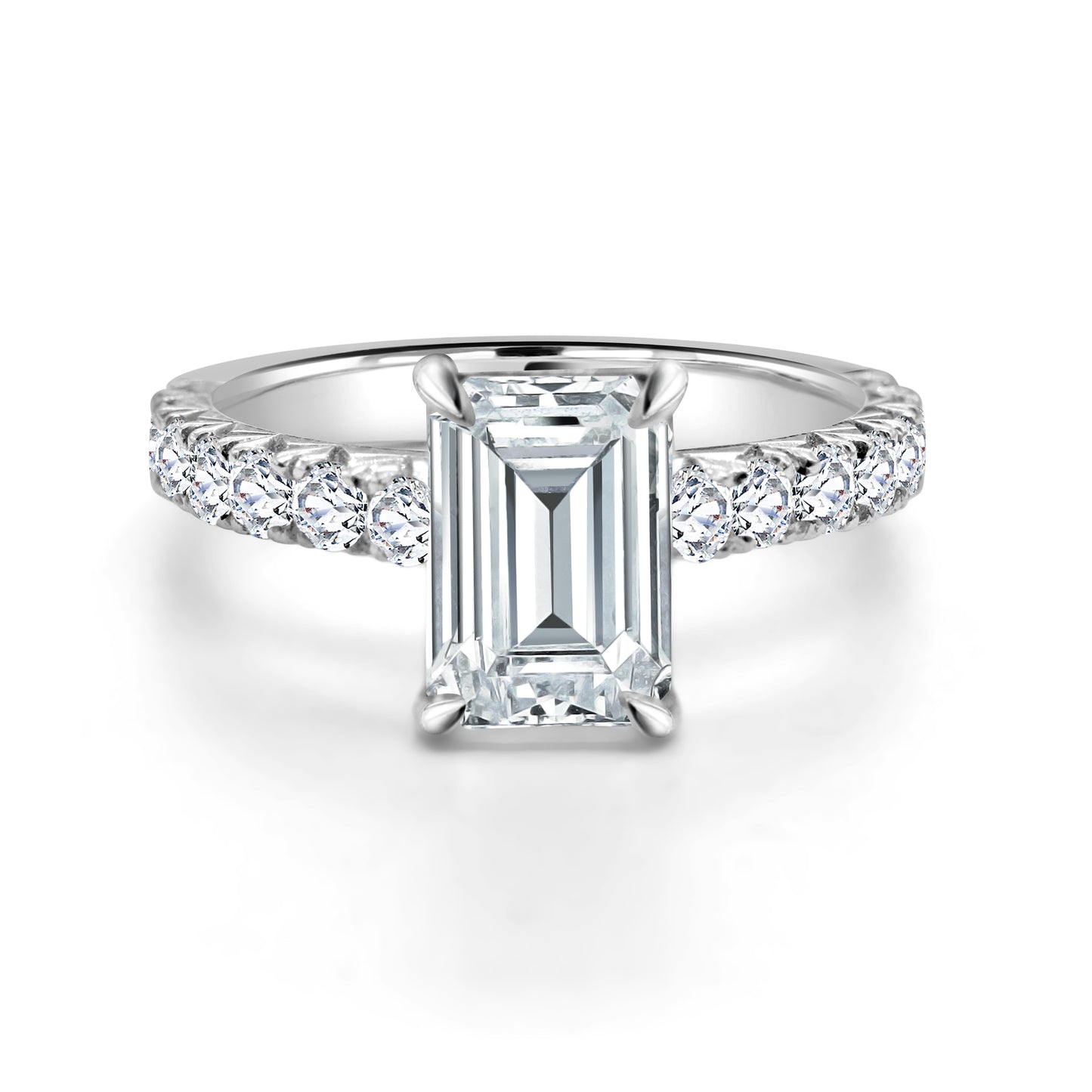 Experience elegance and luxury with our 2.14ct Emerald cut lab grown diamond trilogy engagement ring. Set in 18ct White Gold, this ladies engagement ring features a 14=.79ct round brilliant cut lab diamonds in a stunning pave design. Elevate your love with our exquisite and exclusive ring.