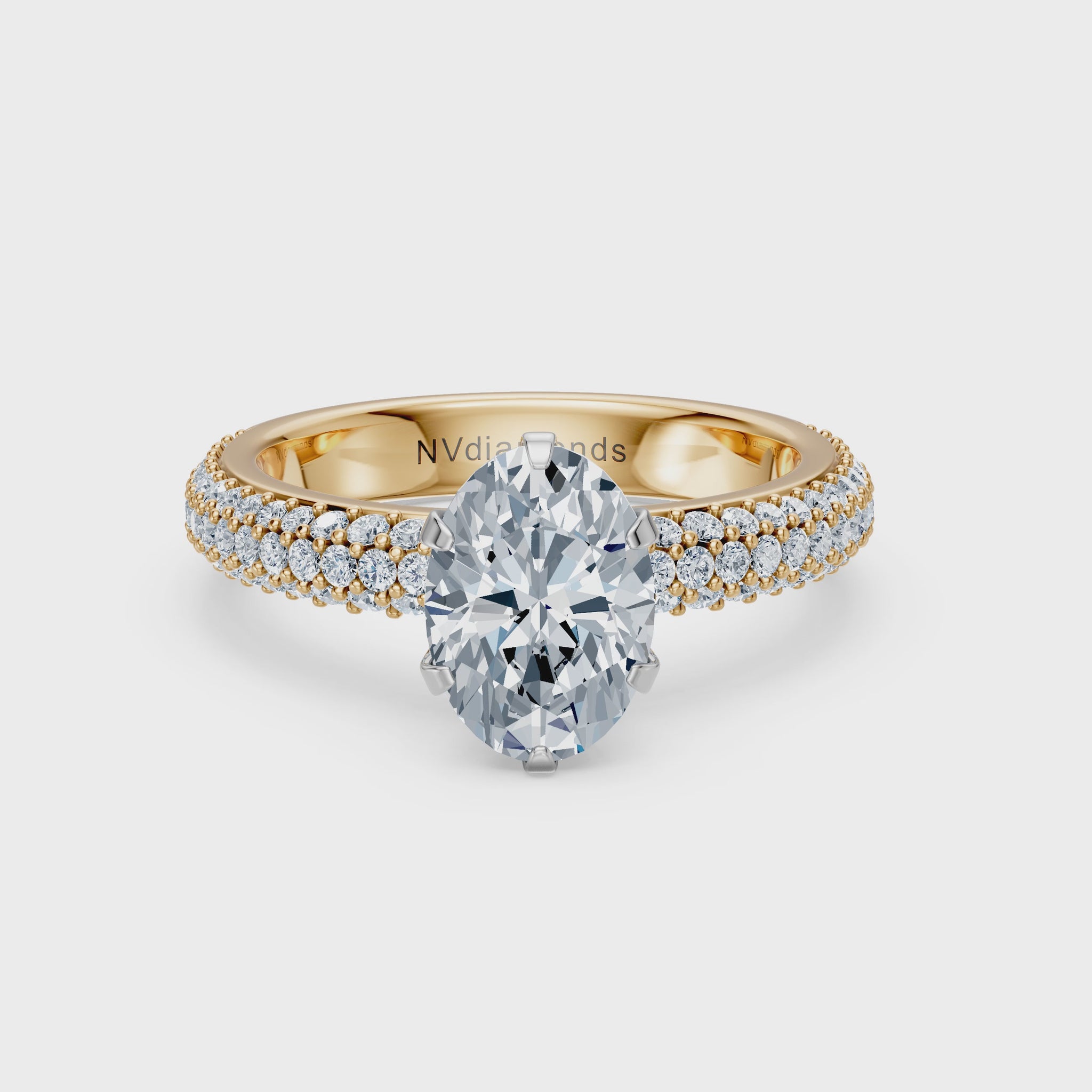 The Valentina-Oval 3 Row Solitaire engagement ring exudes sophistication through its captivating solitaire design. Highlighted by a magnificent triple pavé band, it perfectly complements the 6-claw setting that embraces an exquisite oval center stone, radiating timeless elegance and refined beauty.