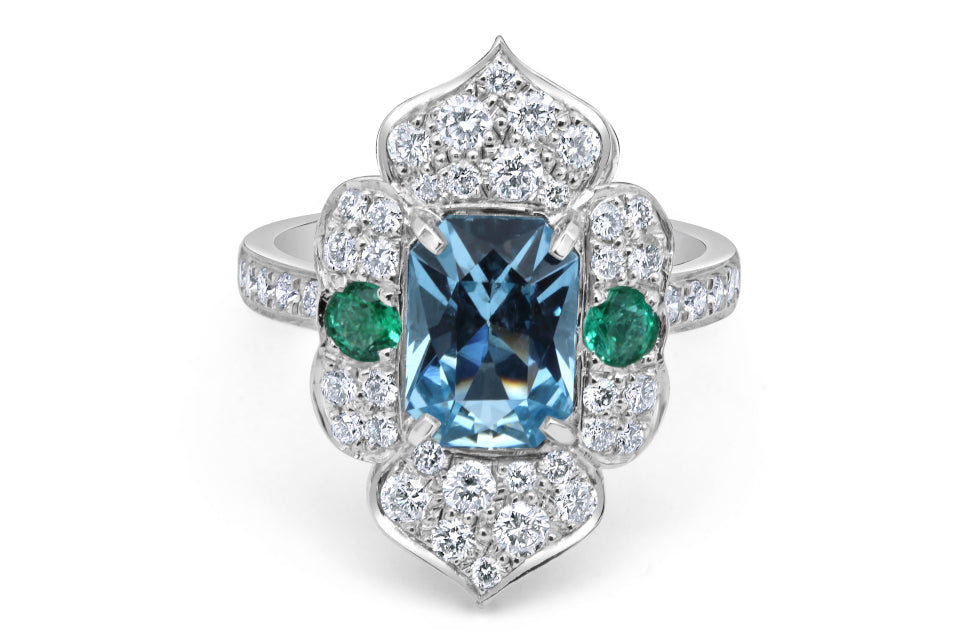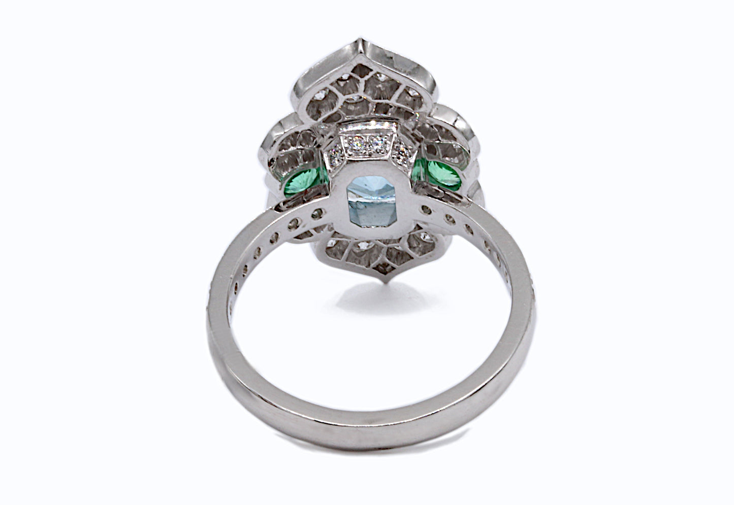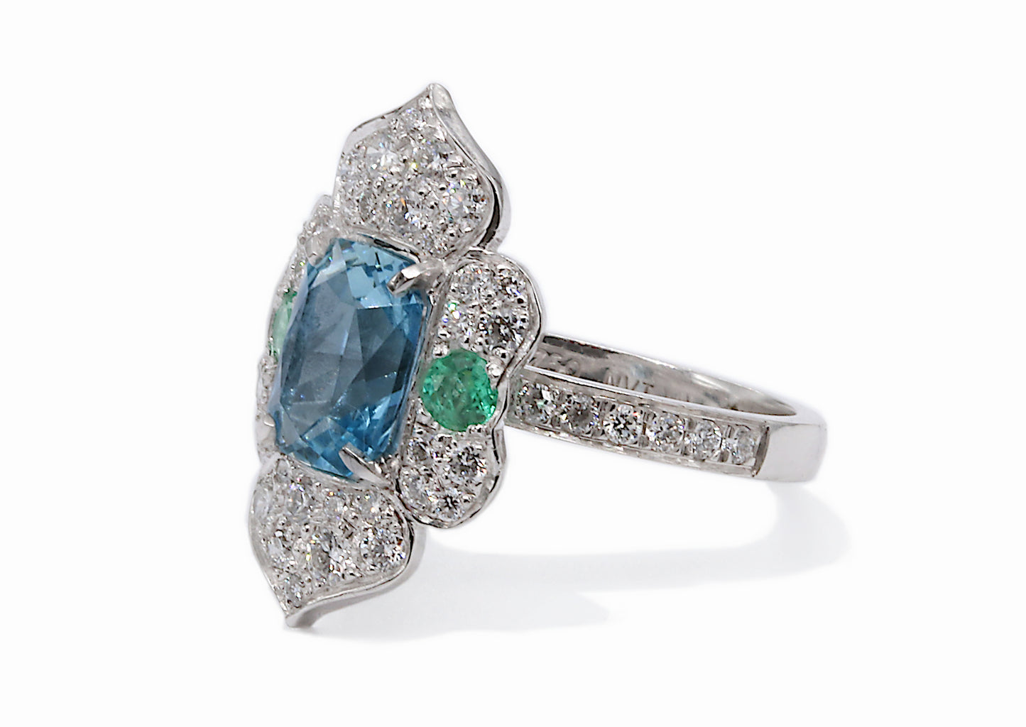 18ct white gold ladies ring set with 1.80ct Aquamarine, 2=.21ct Natural Emeralds and 34=.80ct brilliant cut diamonds.