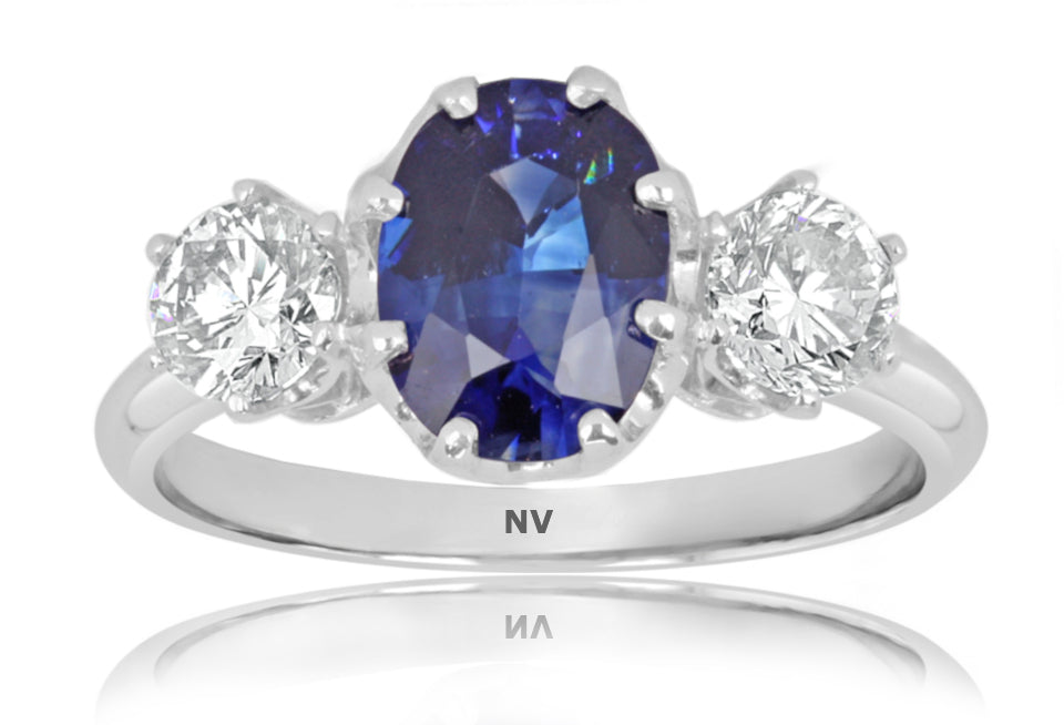 18ct white gold ladies ring set with a 1.50ct Oval shape Ceylon Sapphire and 2=.71ct round brilliant cut diamonds.