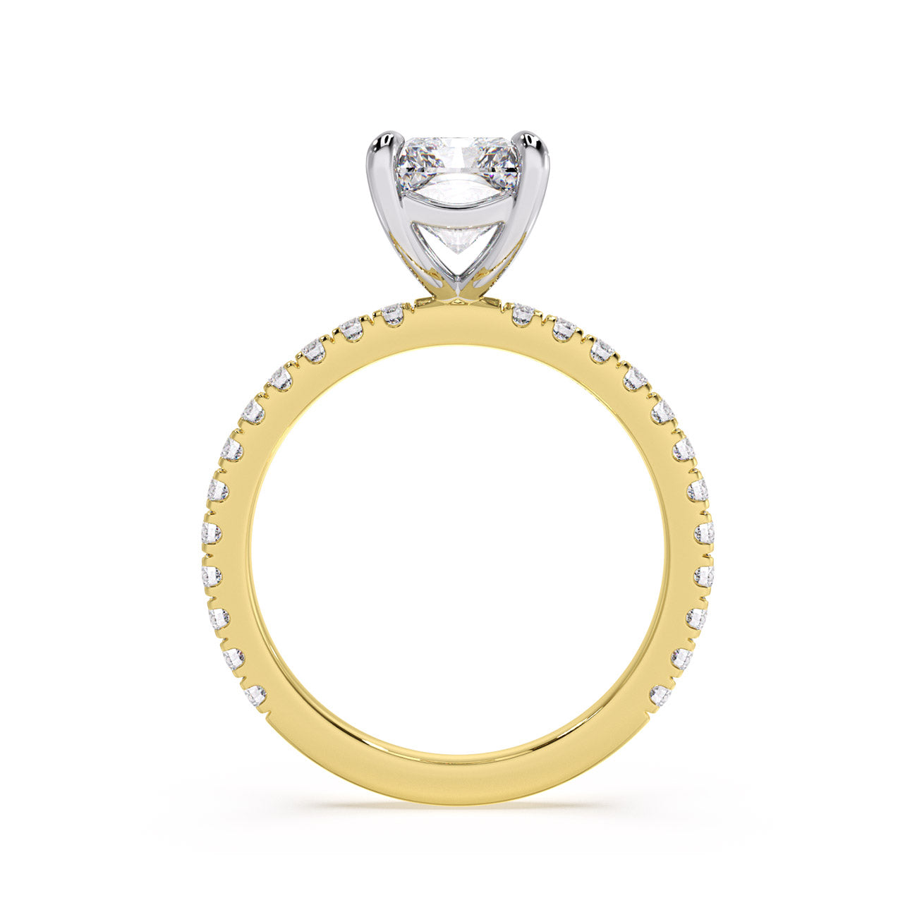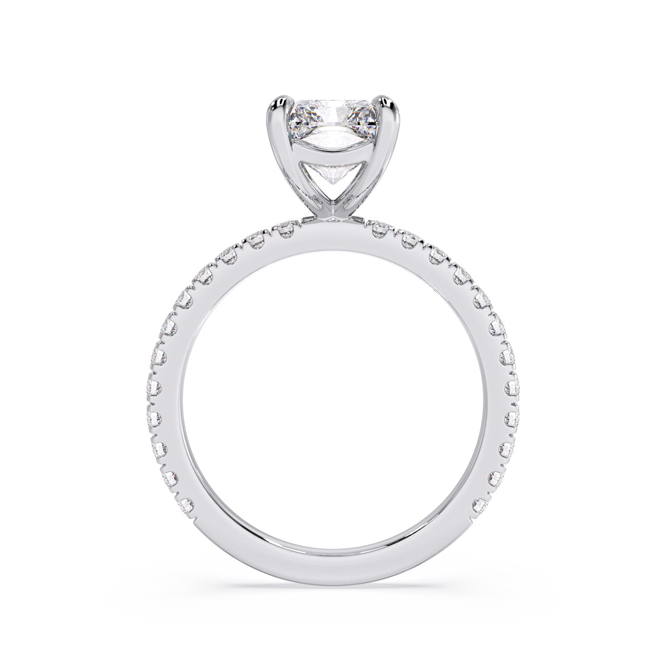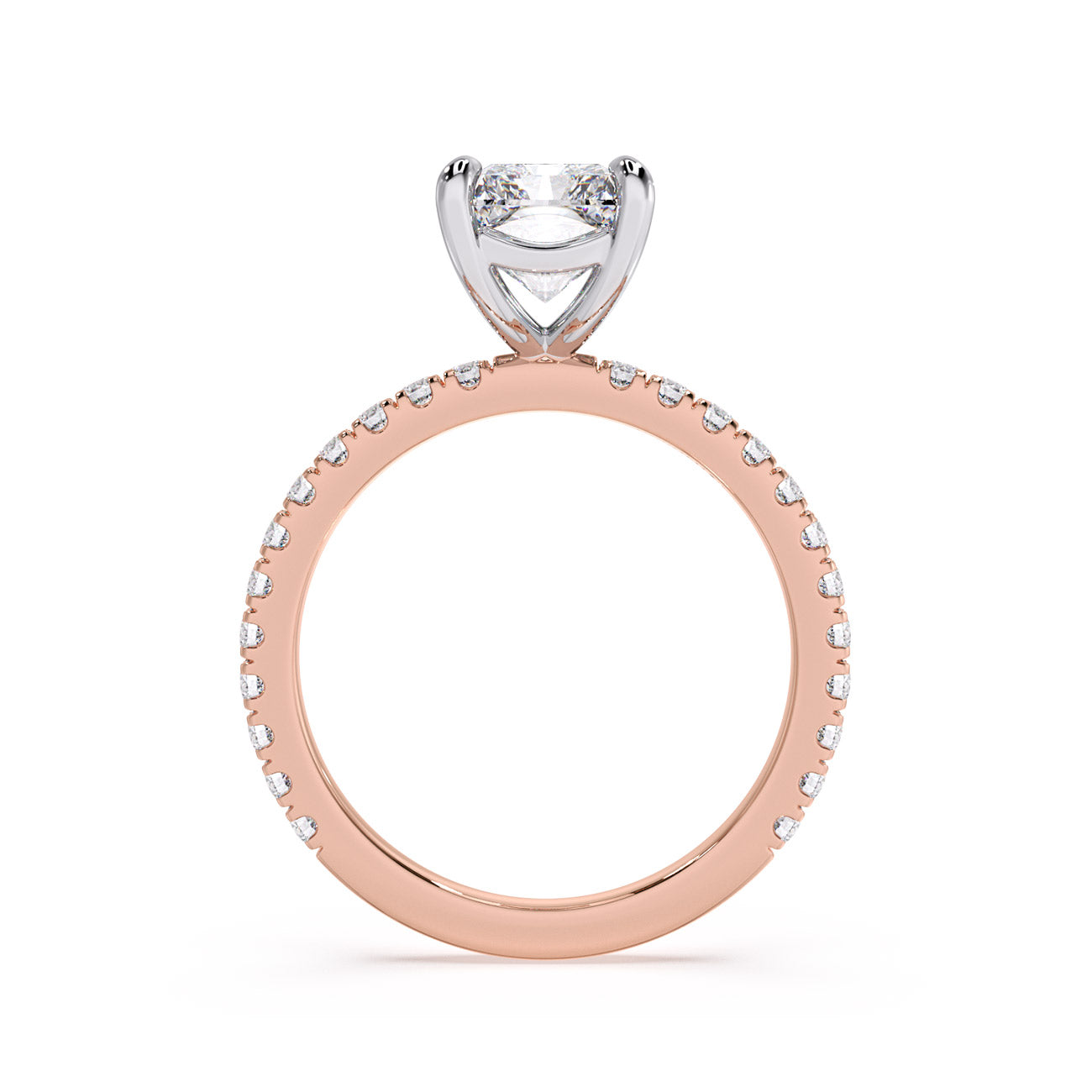 Exuding timeless beauty, Claire stands as our iconic 4-claw pavé solitaire, celebrated for its enduring popularity. This remarkable design makes a striking statement on the finger while facilitating a seamless fit with the wedding band. Claire showcases the centre stone elegantly positioned on a pavé-adorned band, adding an extra layer of sophistication.