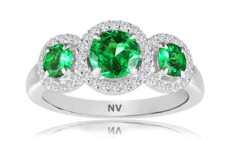 18ct white gold ladies Halo ring set with 3=.81ct Natural Emeralds and 46=.25ct round brilliant cut diamonds.