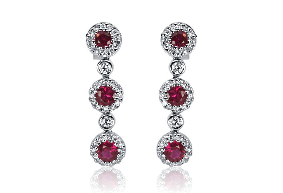 18ct White Gold Ladies Drop Design Earrings set with 6=.94ct Natural Rubies and 76=.37ct round Brilliant cut Diamonds.