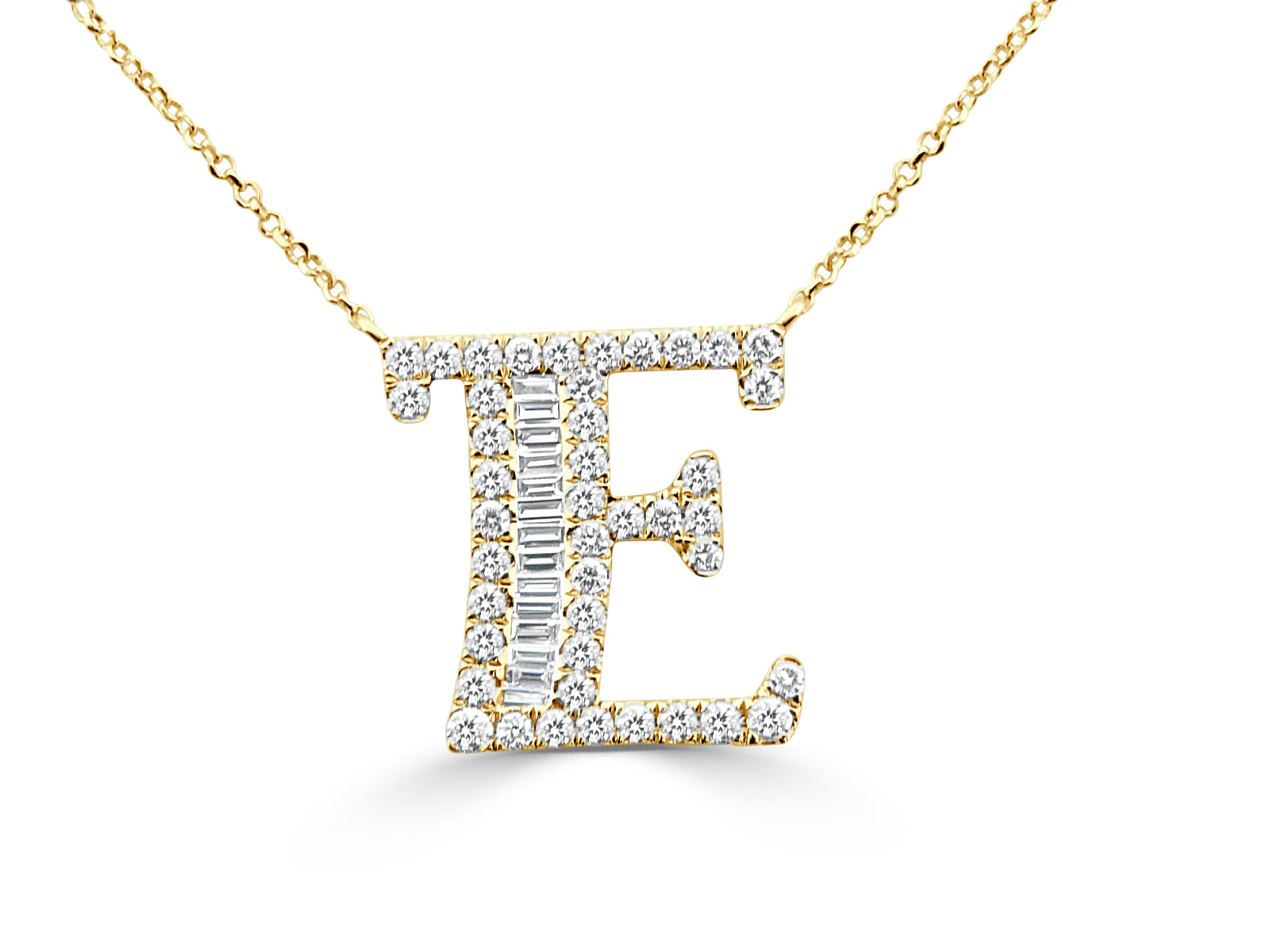 Elevate your jewellery collection with this exquisite 18ct gold initial pendant, personalised with the letter "E". Meticulously crafted, this piece features 57 diamonds in round brilliants, and baguettes—creating a luminous, multidimensional sparkle. The thoughtful combination of diamond shapes adds refined depth and movement to the design. Choose from white, yellow, or rose gold to complement your personal style and existing jewellery. A timeless investment piece that celebrates individuality with understated elegance.
