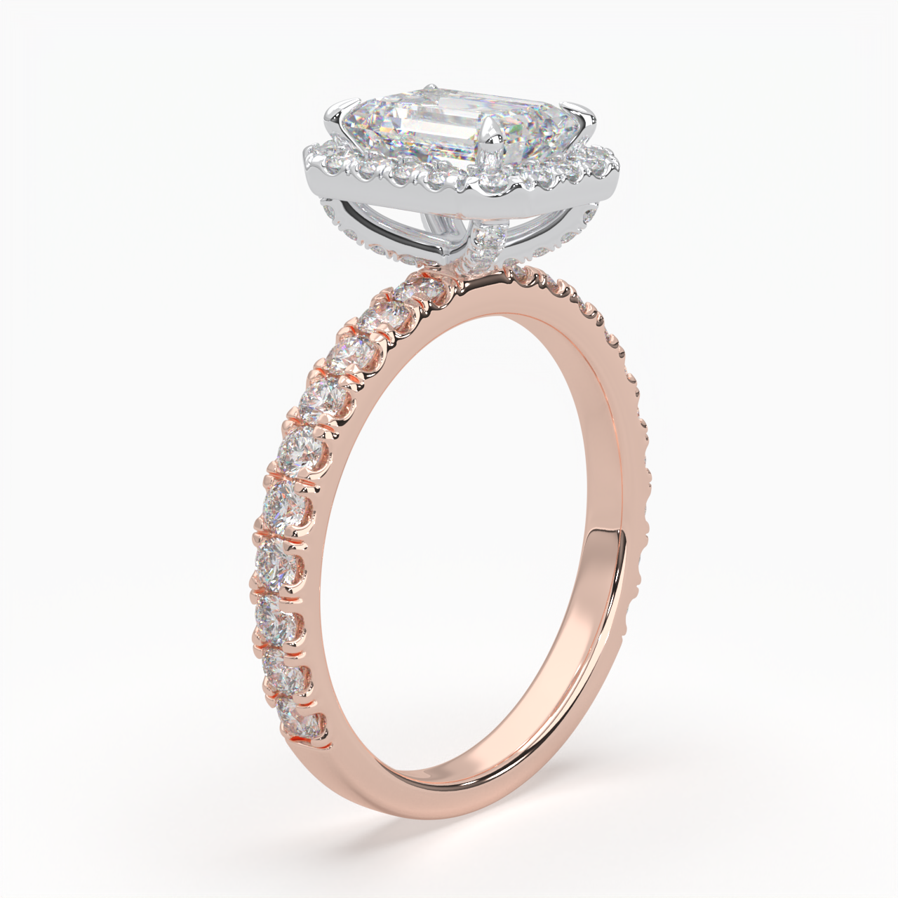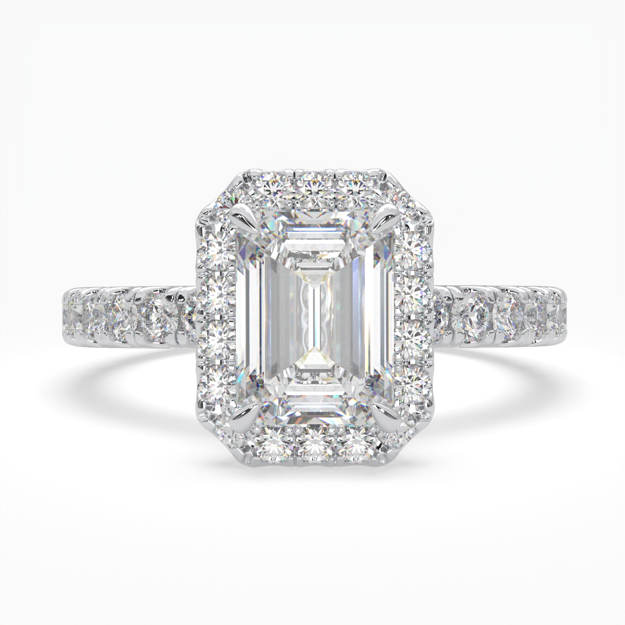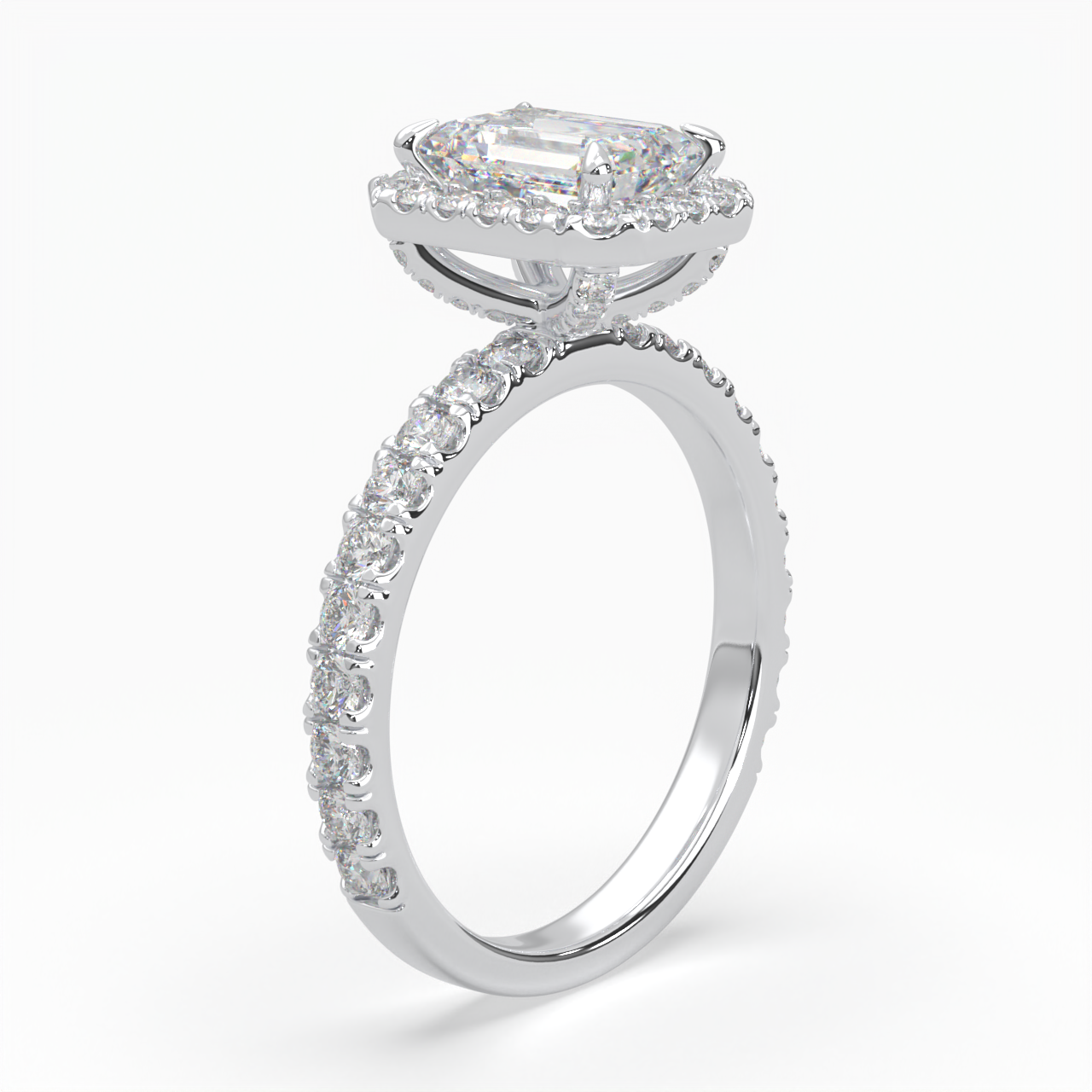 Emerald Cut Cathedral Halo Cluster Ring set with accent diamonds on band and setting LR029R