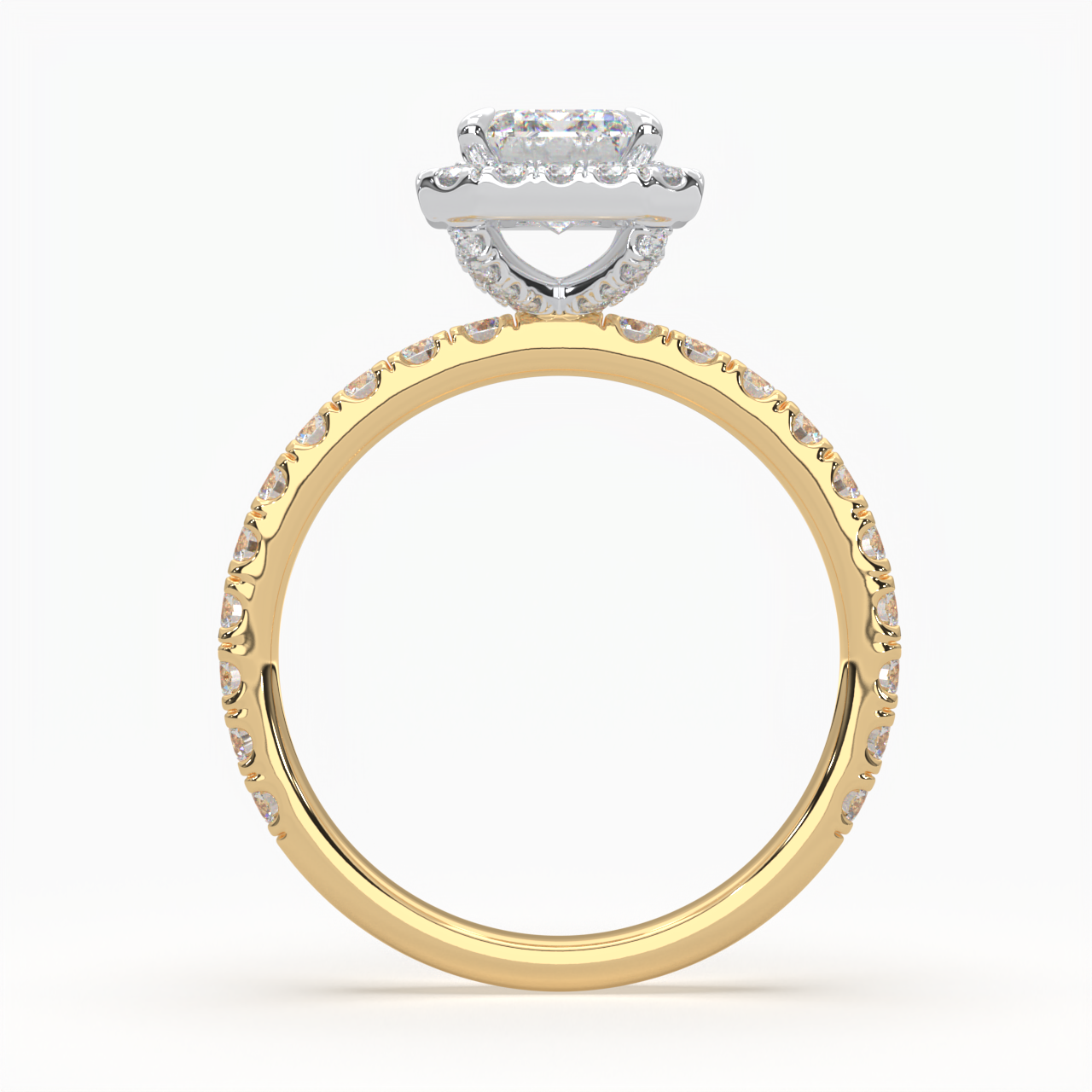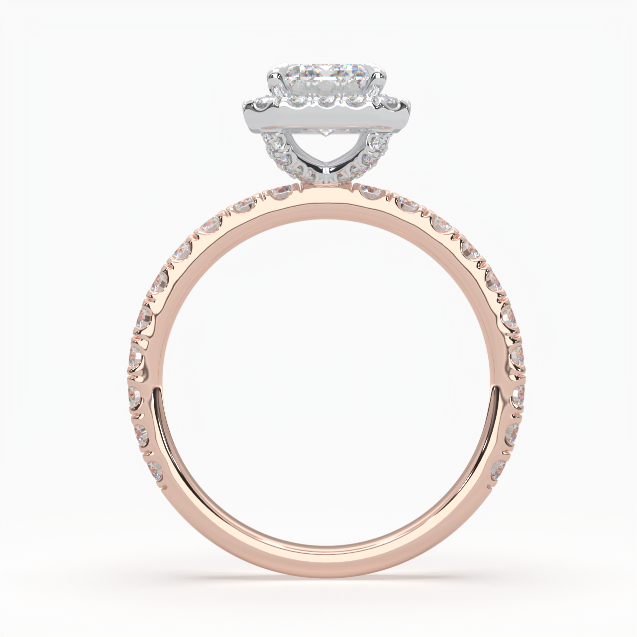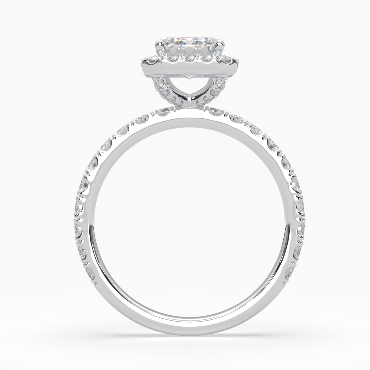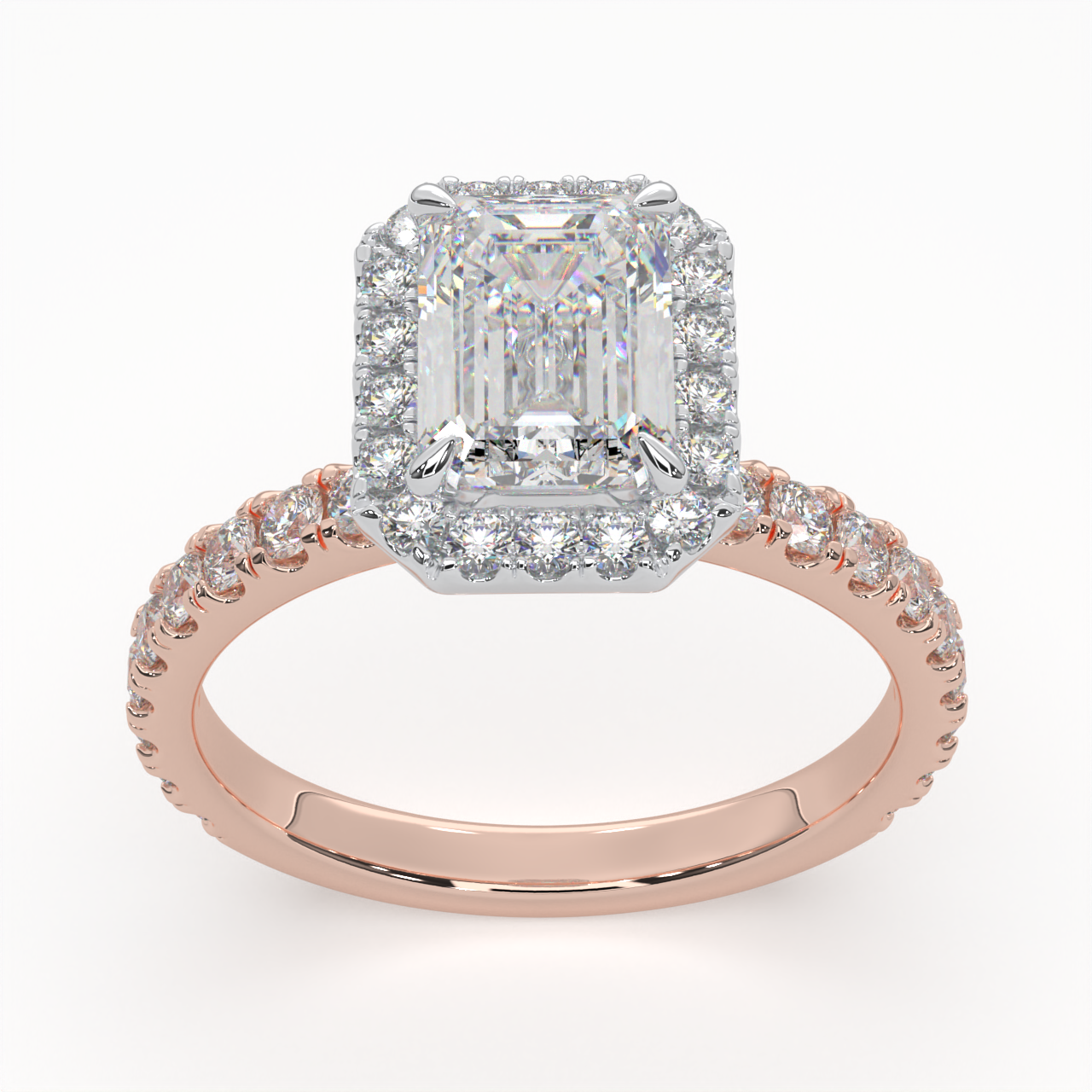 Emerald Cut Cathedral Halo Cluster Ring set with accent diamonds on band and setting LR029R