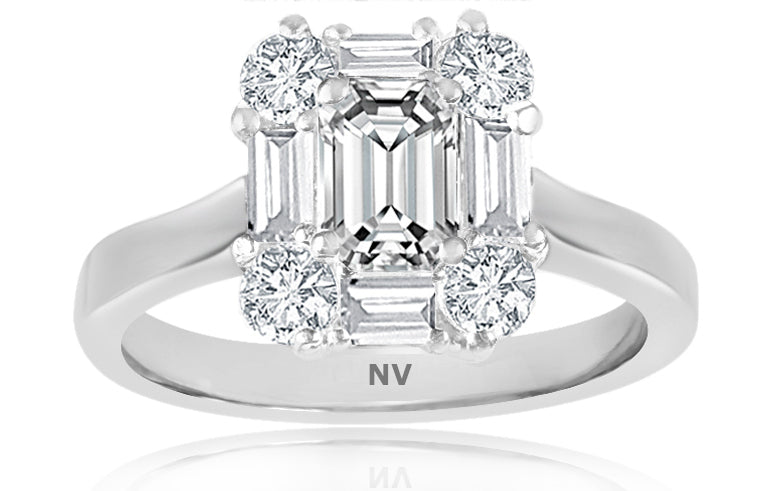 18ct white gold ladies ring set with .57ct Emerald cut diamond, 4=.41ct round diamonds and 4=.26ct Baguette diamonds.