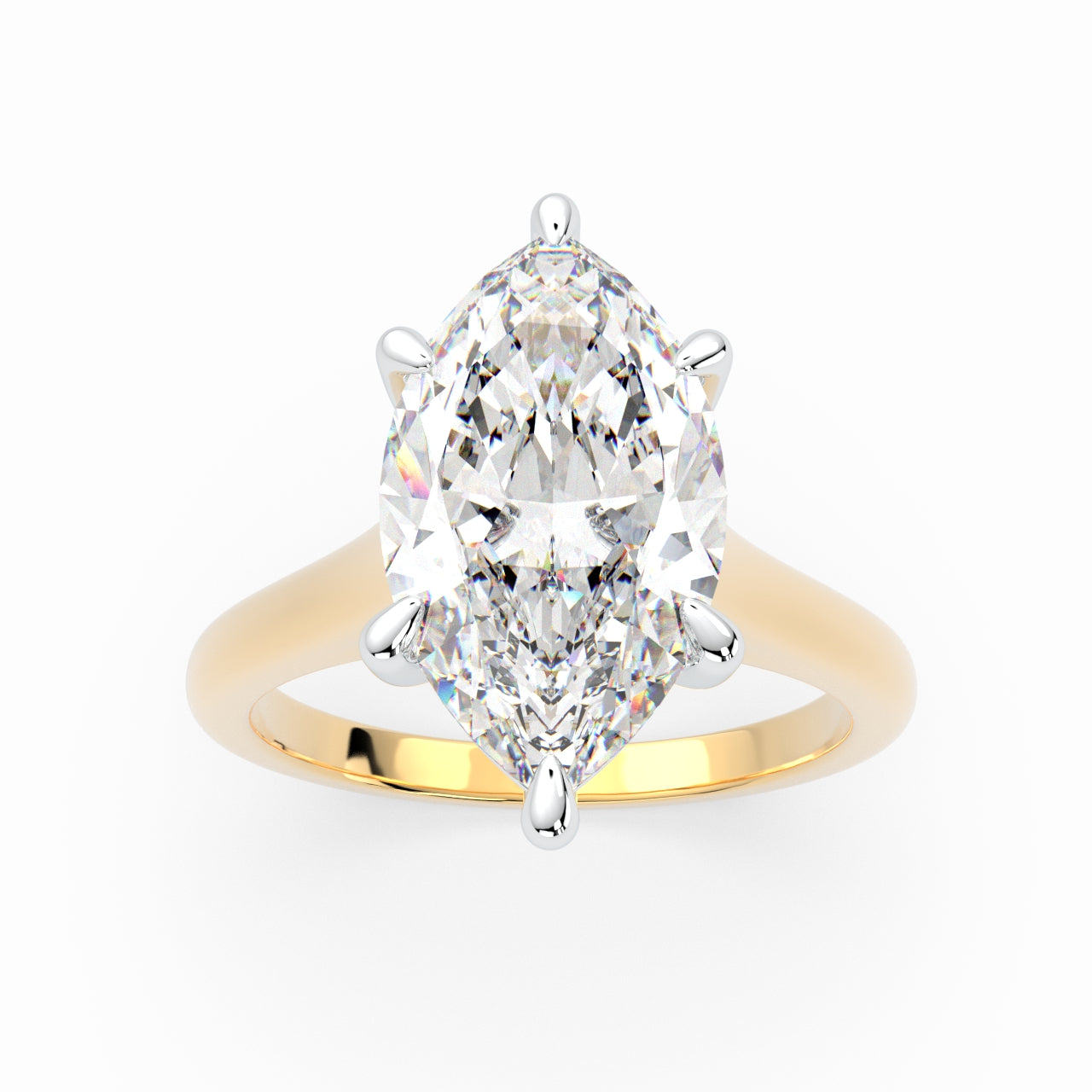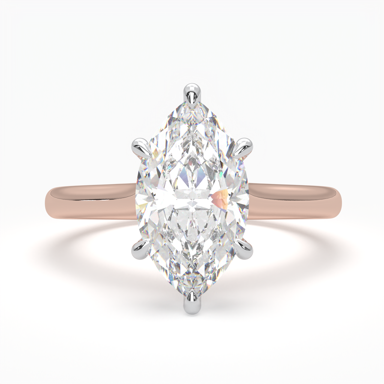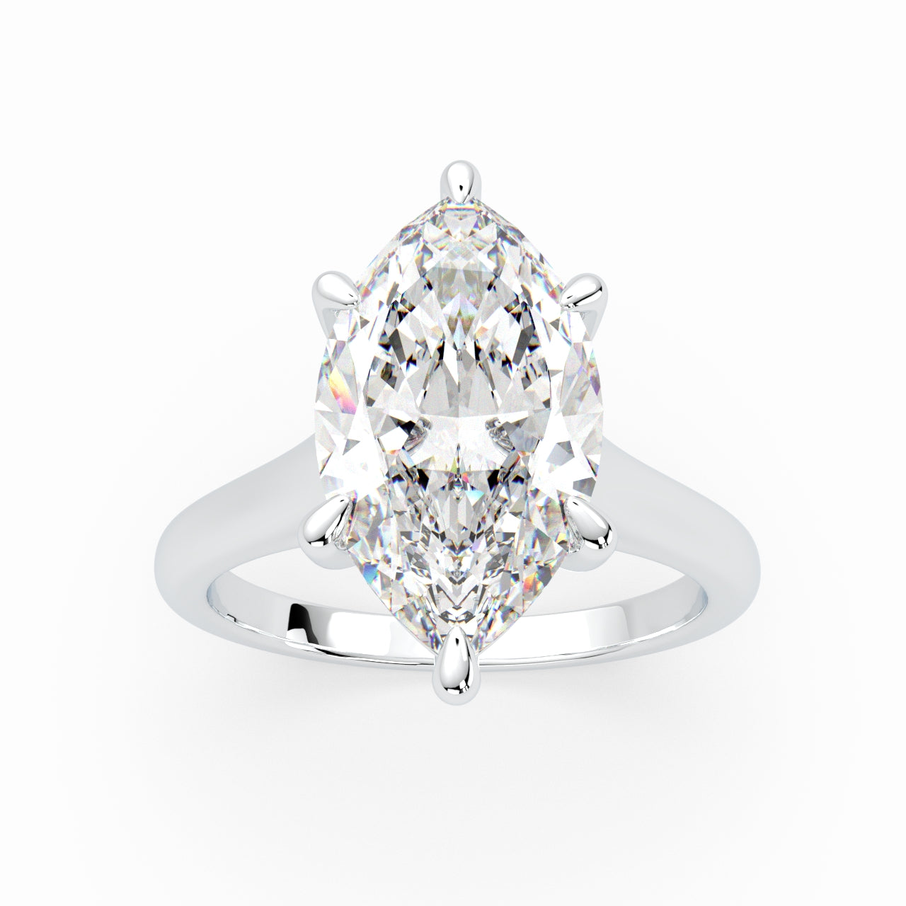 An elegant Marquise solitaire ring is sure to please the minimalistic bride. Set in a 6 claws basket on a 2.20mm swept up band. This timeless design shows off the unique elongated facets of a marquise stone – a modern treasure for a minimal bride.