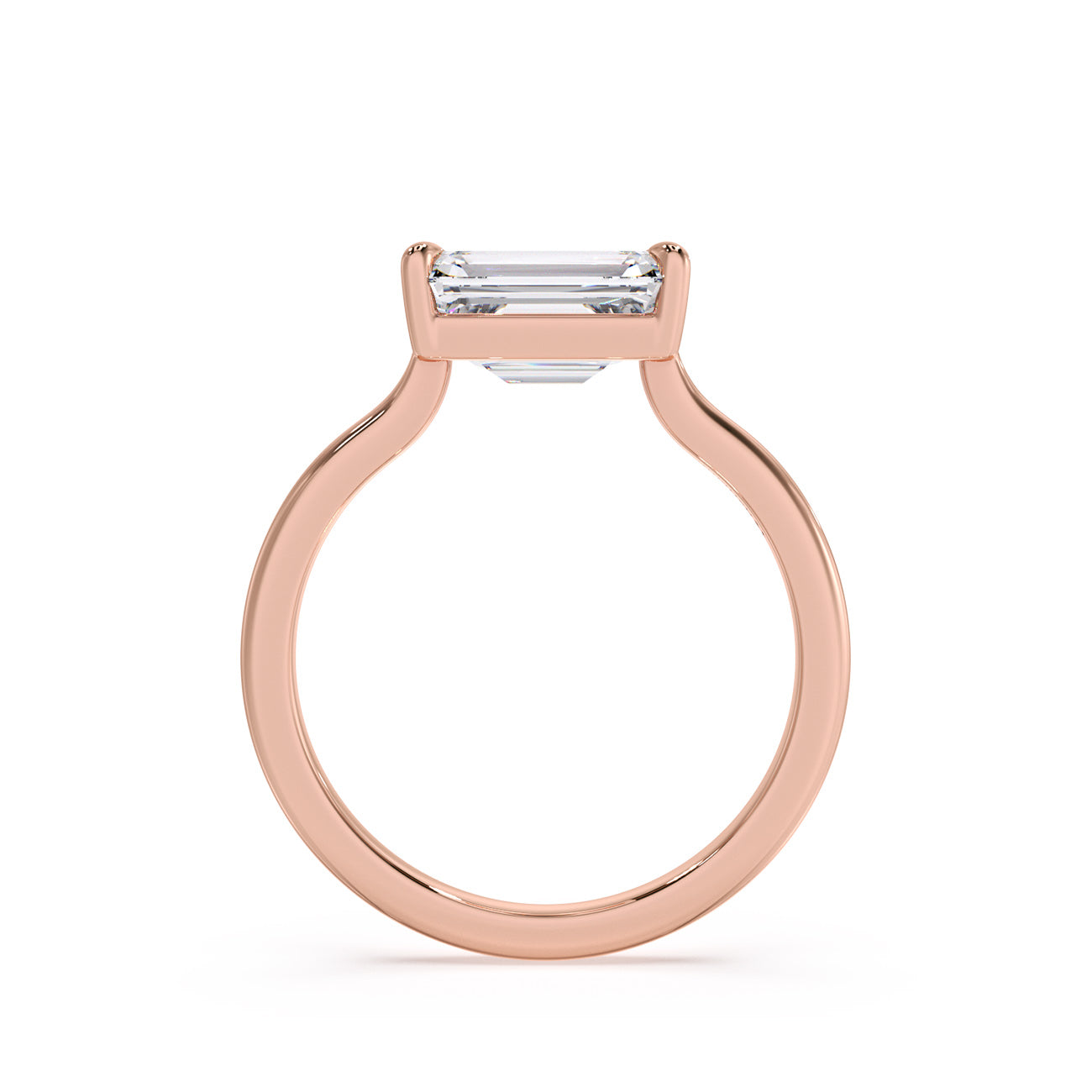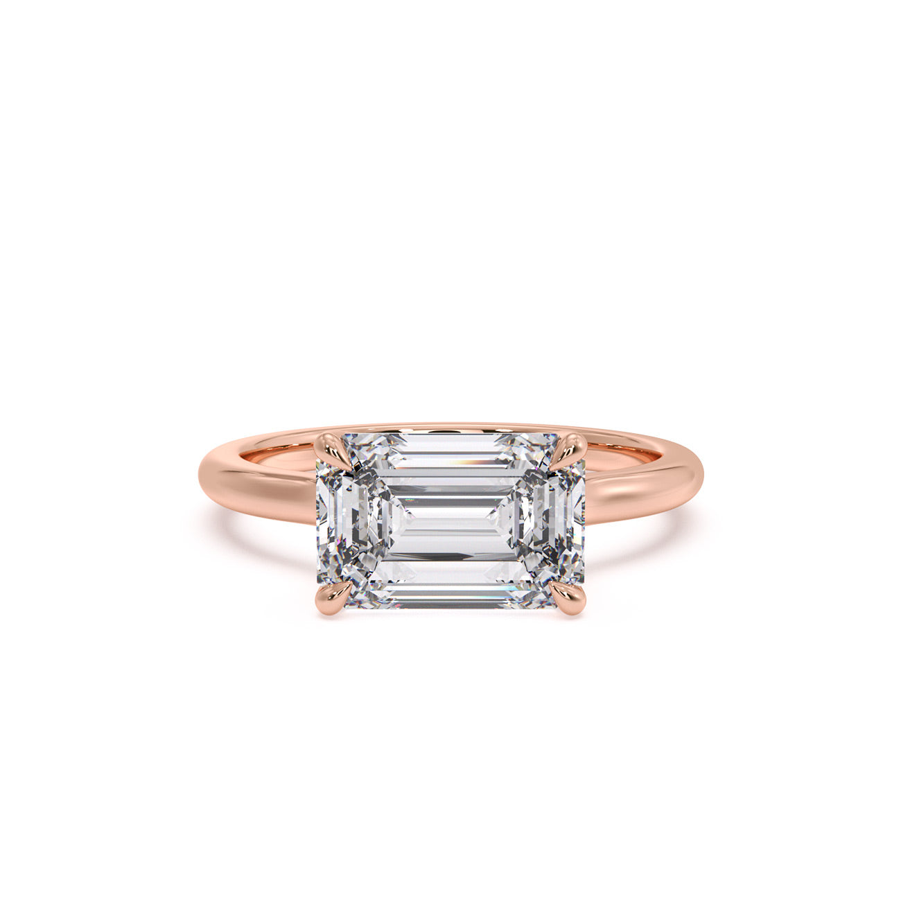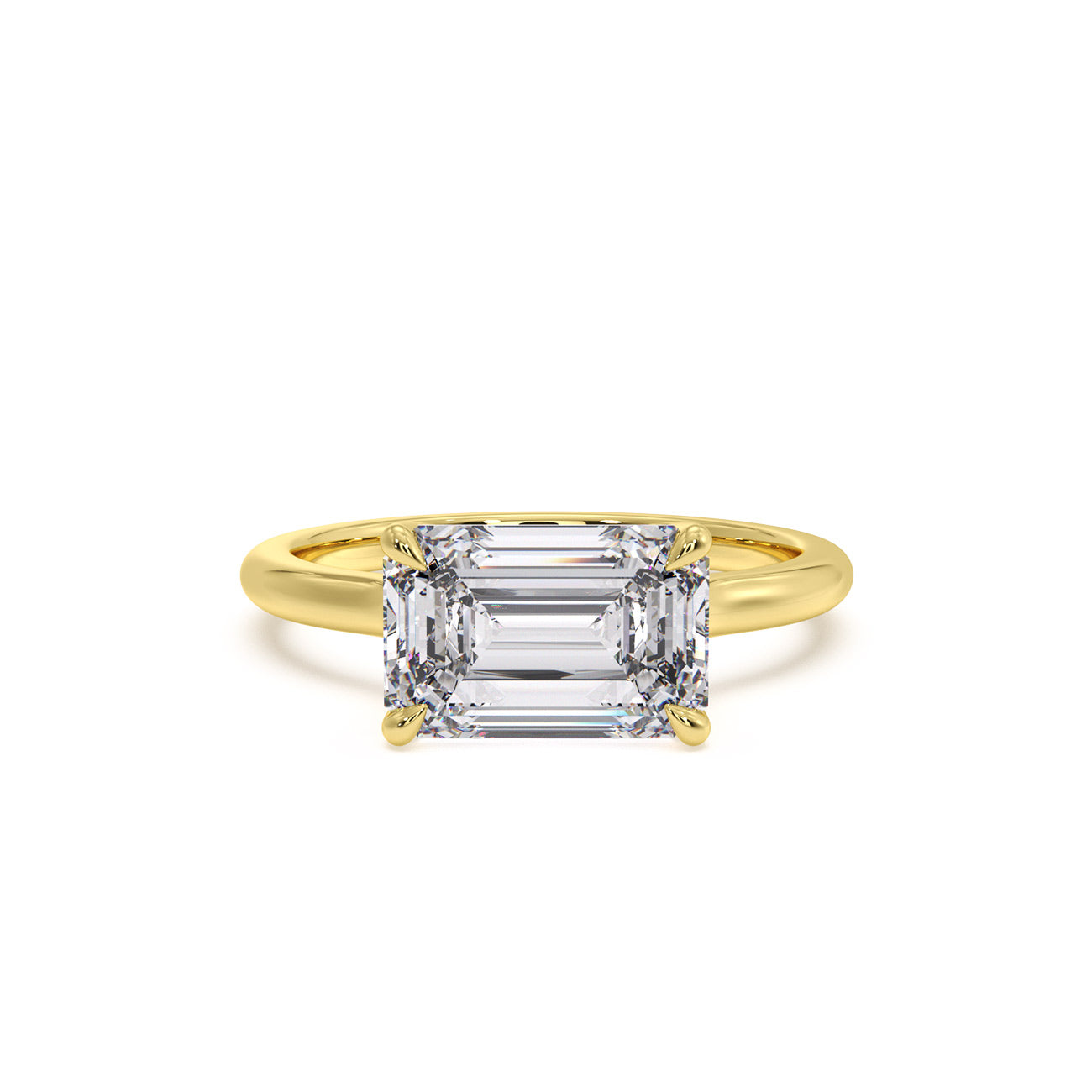 The Mercy engagement ring represents our distinctive east-west design. This elegant four-claw setting brings a contemporary twist to the classic solitaire ring, adding a sense of direction to its traditional appeal. Illustrated with a stunning emerald-cut gem nestled on a sleek, polished band, Mercy exemplifies modern elegance with its simplicity.