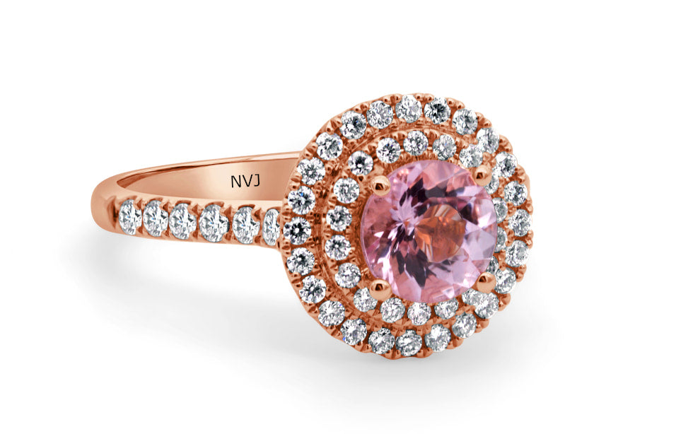 18ct Rose Gold ladies double halo ring set with .82ct Morganite and 54=.45ct round brilliant cut diamonds.