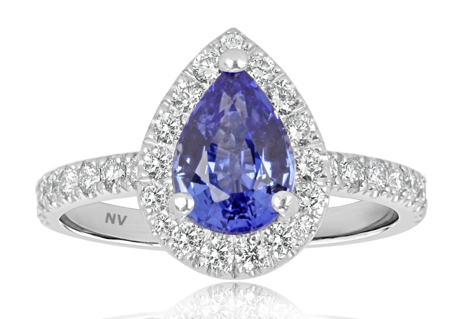 Platinum ladies ring set with 1.21ct Pear shape Ceylon Sapphire and 34=.35ct round brilliant cut diamonds.