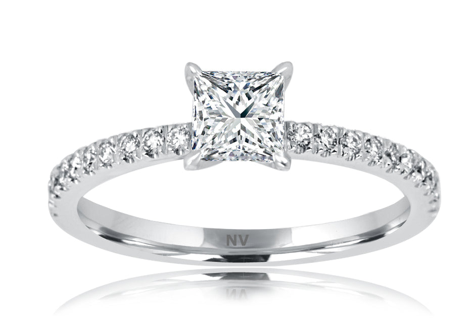 18ct white gold ladies engagement ring set with 1x.60ct Princess cut diamond, DCLA Certified, Colour D, Clarity VVS2 and 22=.20ct round brilliant cut diamonds.