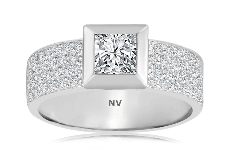 18ct White Gold Ladies engagement ring set with 1x.71ct Princess cut Diamond, GIA Certified Colour E, Clarity VS1 and 64=.70ct round brilliant cut diamonds in pave setting.