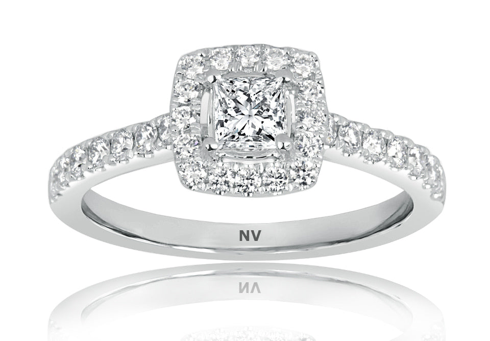 18ct white gold ladies ring set with .30ct Princess cut diamond and 30=.38ct round brilliant cut diamonds.