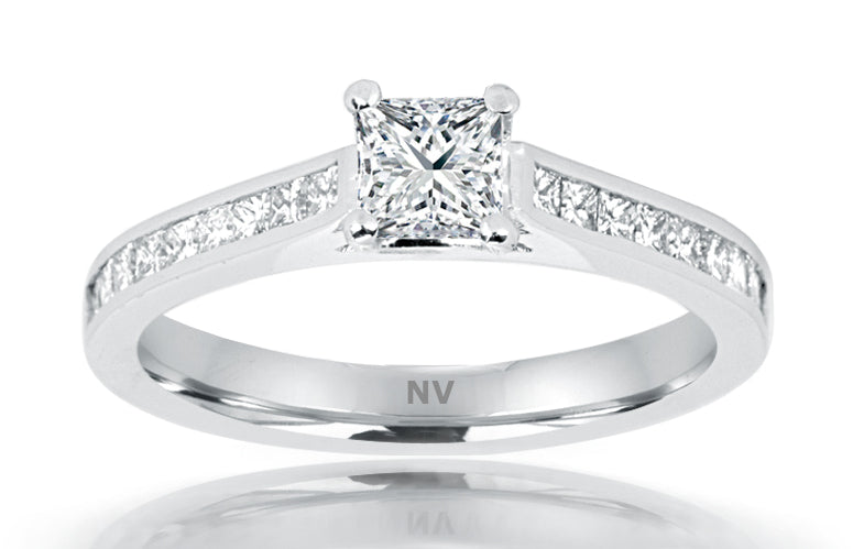 18ct white gold ladies ring set with 1x.42ct Princess cut diamond, Colour E, Clarity SI1 and 18=.36ct round brilliant cut diamonds.