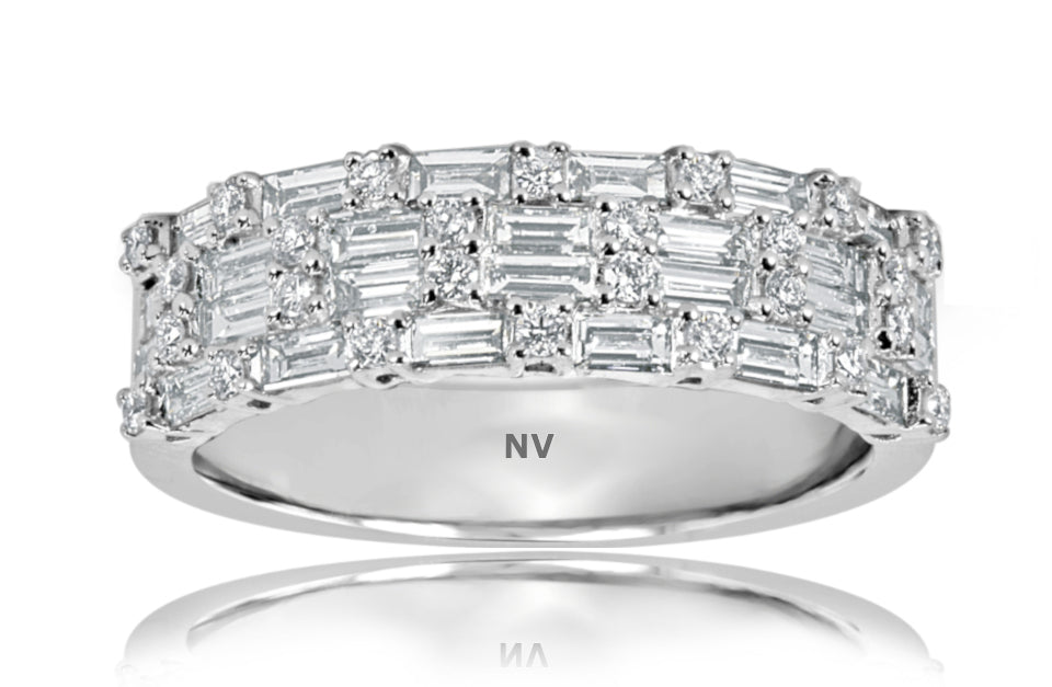 18ct white gold ladies ring set with 26=.86ct Baguette diamonds and 26=.20ct round brilliant cut diamonds.