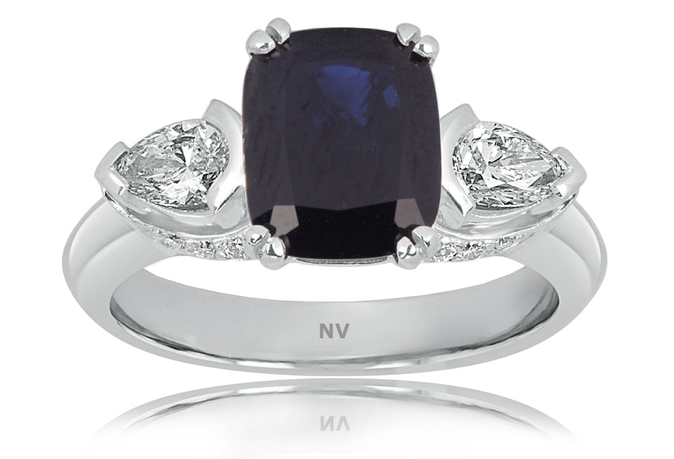 CLM005 (Coloured) 18ct white gold ladies ring set with 1x2.50ct Cushion shape Australian Sapphire, 2=.46ct Pear shape diamonds and 10=.10ct round brilliant cut diamonds.