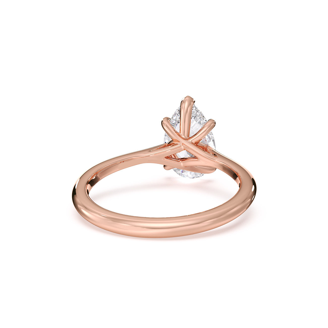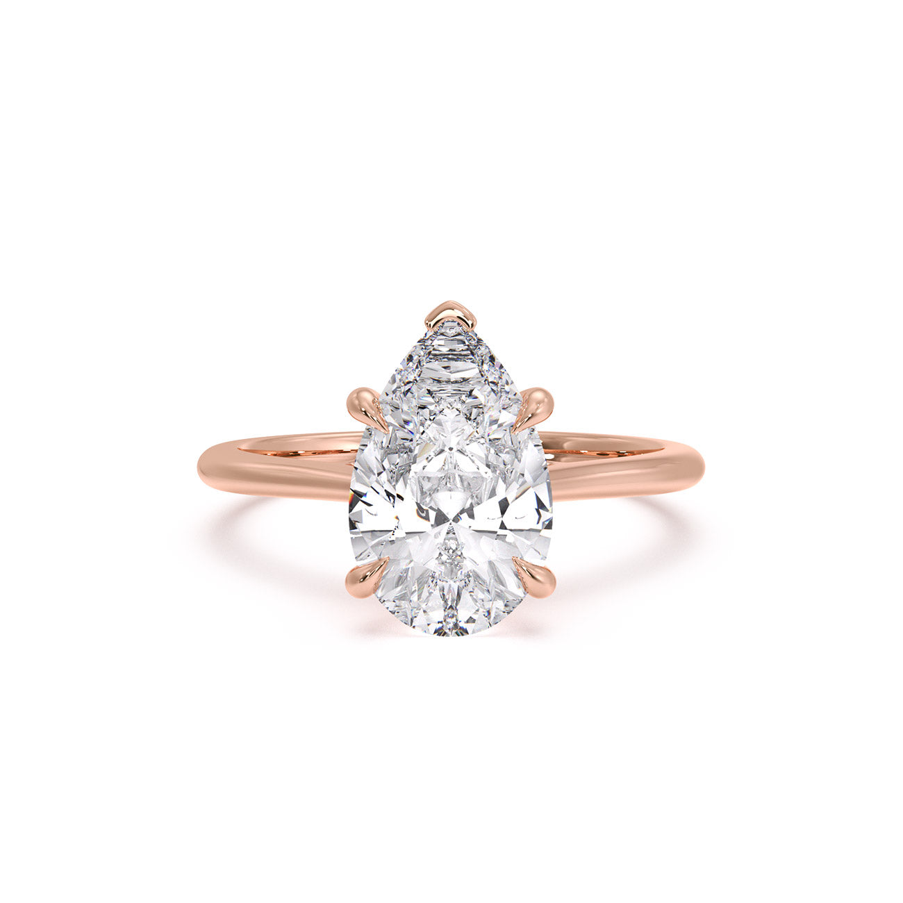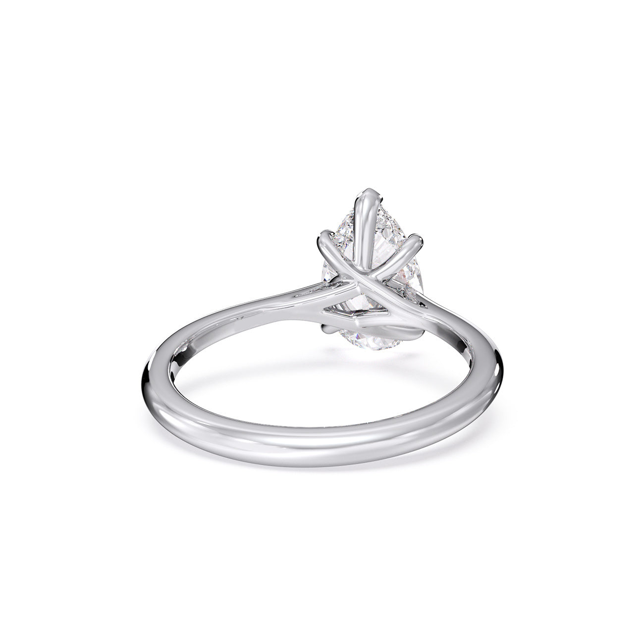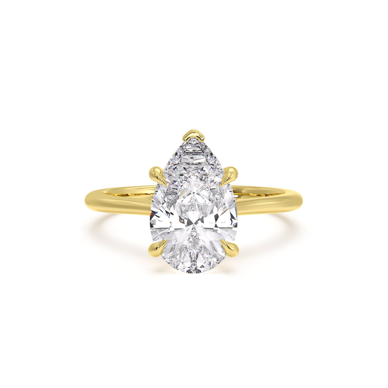 A vision of subtle elegance, Sara captivates with its charming Pear solitaire engagement ring. Presented here, five slender claws delicately secure the centre stone, resting atop a gracefully curved trellis cathedral setting. This exquisite design is complemented by a polished band, adding the perfect finishing touch.