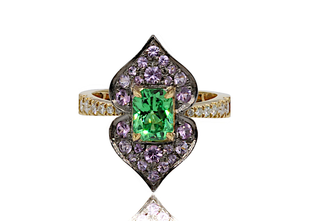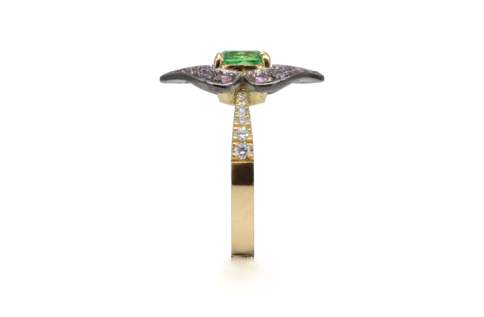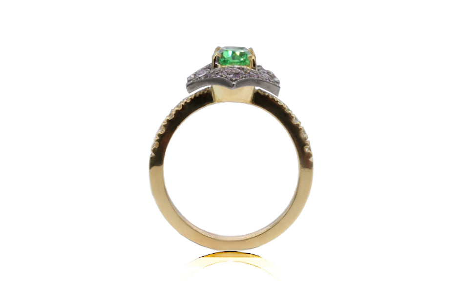 18ct yellow gold ladies ring set with 1.25ct Tsavarite, 24=.46ct Pink Sapphires and 12=.20ct round brilliant cut diamonds.