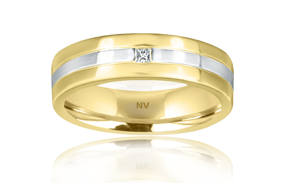 18ct Two tone Mens wedding ring set with 1x.05ct Princess cut Diamond