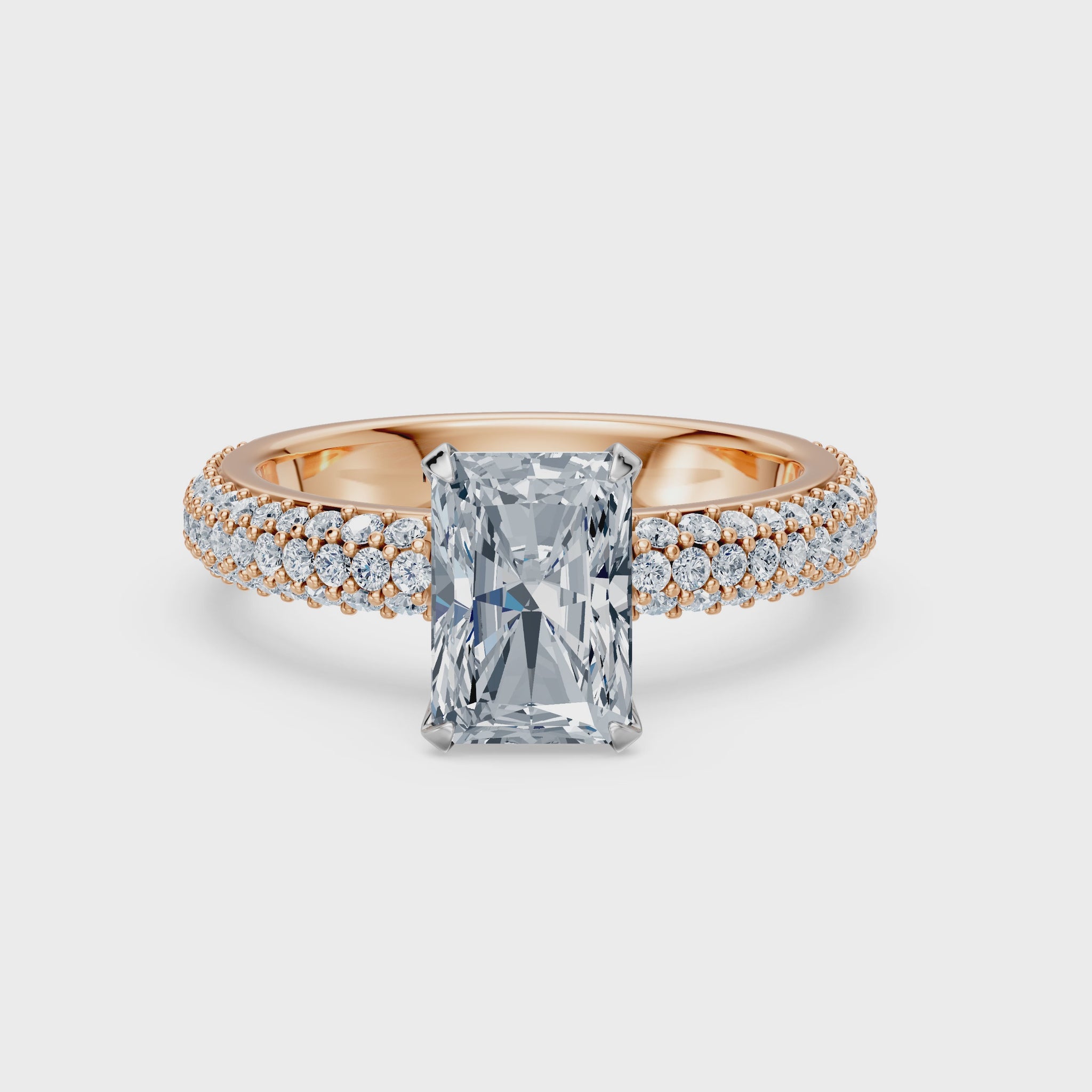 The Valentina-Radiant 3 Row Solitaire engagement ring exudes sophistication through its captivating solitaire design. Highlighted by a magnificent triple pavé band, it perfectly complements the 6-claw setting that embraces an exquisite oval center stone, radiating timeless elegance and refined beauty.